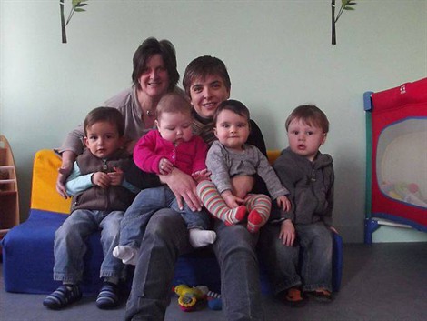 Brigitte Eon et Sylvie Guillorel, en compagnie d’une partie des enfants qu’elles gardent chaque jour dans leur maison d’assistantes maternelles.